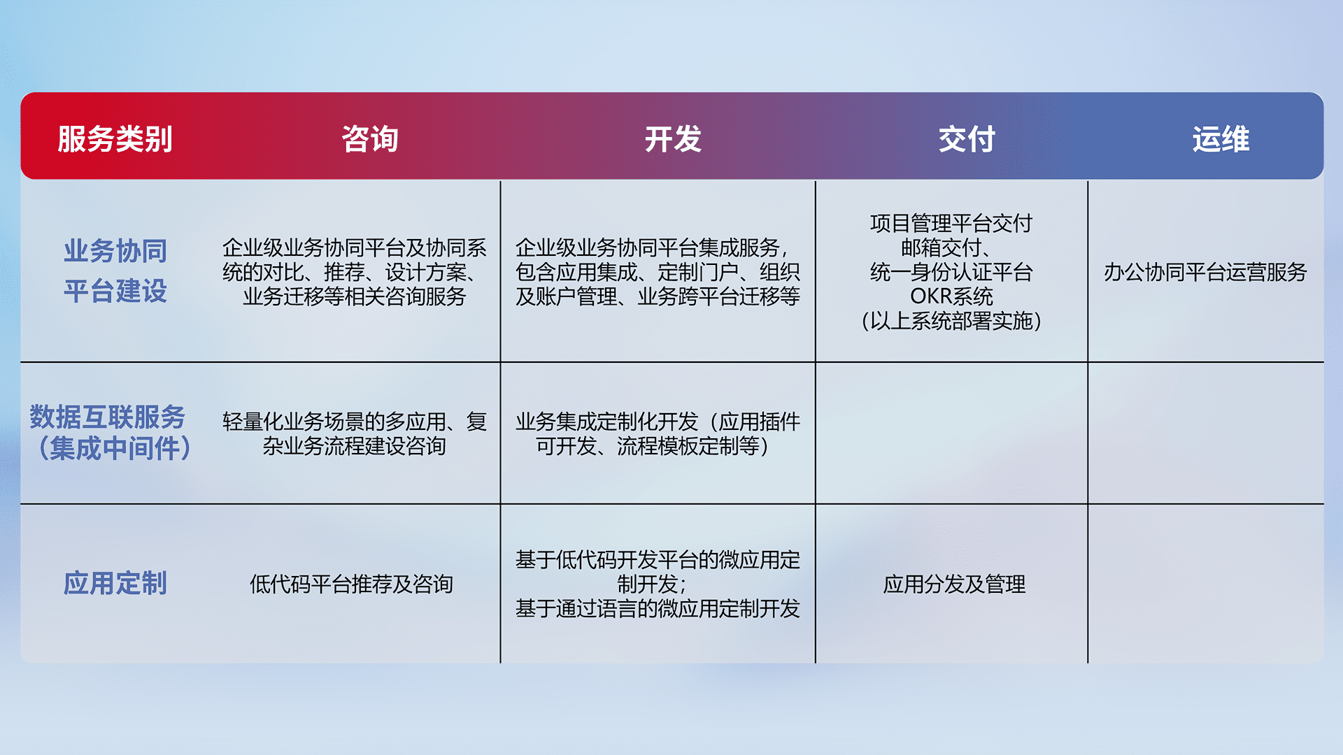 针对钉钉、、企微、、、、IDaas等平台级产品提供产品的规划、、方案、、、交付、、、定制化开发等服务,,,实现如统一协同办公、、、智能客户服务、、、、混合会议管理、、、智能数据查询、、、、等业务场景,,,实现数字化转型。。。。